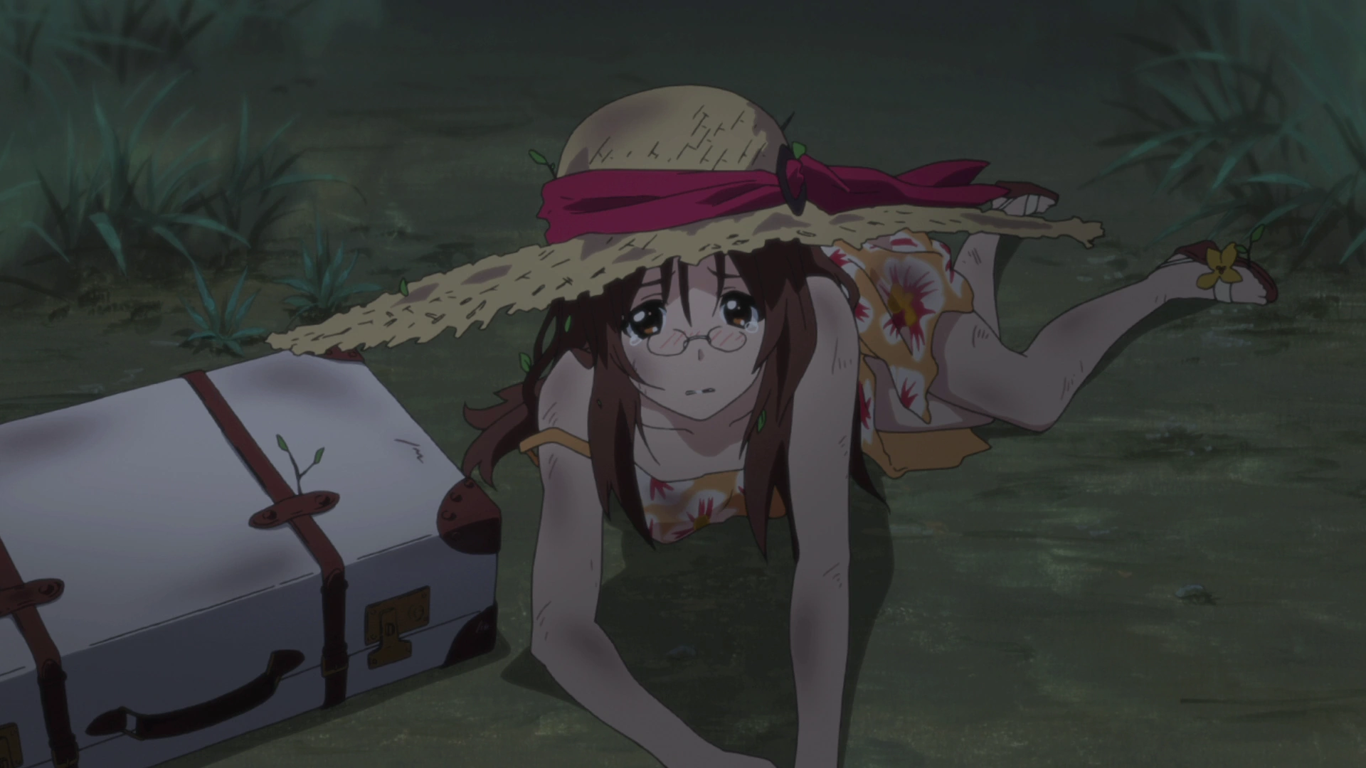 After the meal, everyone has fun with fireworks until Ritsu decides to have a test of courage. As Azusa accompanies the nervous Mio, their teacher Sawako appears out of nowhere, looking very exhausted yet relieved that she finally found someone from the club after getting lost. Mio receives such a big shock from Sawako's appearance that she suffers from it for almost the entire evening.