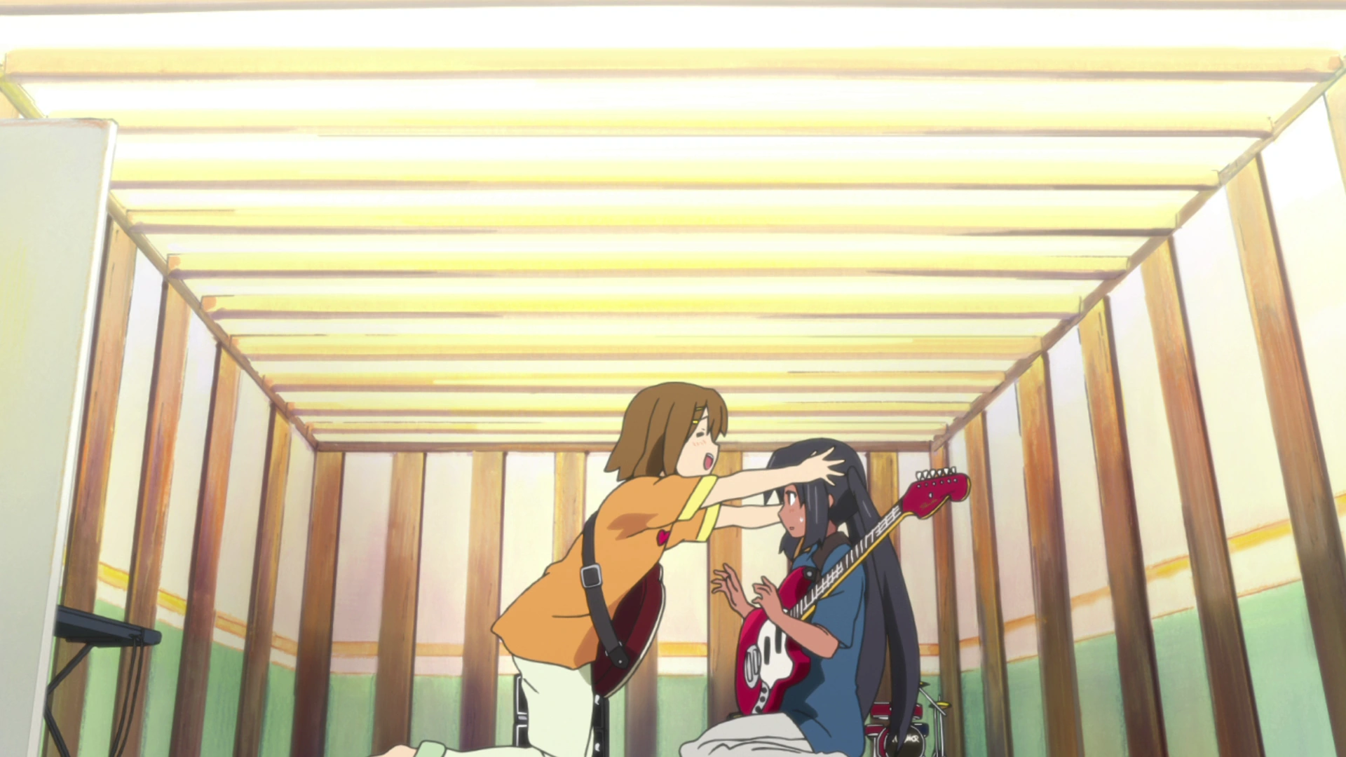 After the test, everyone takes a bath and goes to bed. Azusa can't sleep however, allowing her to notice Yui actually practicing guitar by herself. Elated to see Yui taking the club seriously, she helps her senior practice, much to Yui's delight.