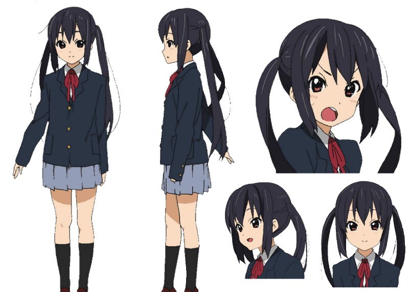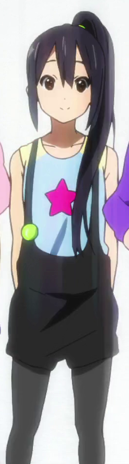 Azusa has long, straight, and seemingly thin black hair, which she wears in pigtails. She also has brown eyes that have a red-orange tint. Compared to Mio's black hair color, Azusa's hair looks purple-tinted in the anime. She is the shortest member of the group. Azusa's skin is a similar shade to those of the other girls, but she's sensitive to sunlight and tans easily even with heaps of sunscreen on although sunscreen does not prevent tans, only sunburns.
