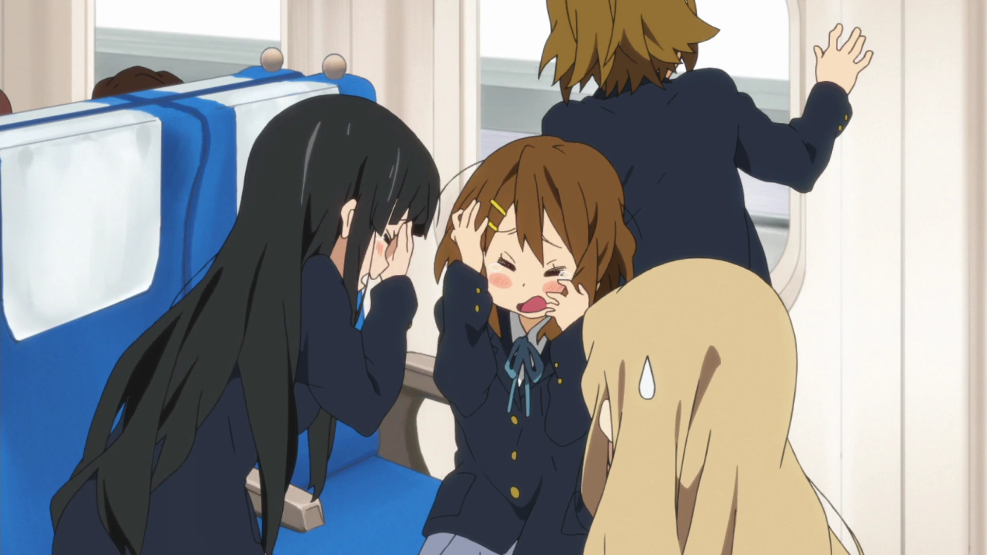 On the way to its destination, the Shinkansen eventually passes Japan's largest mountain, Mount Fuji. Excited, Yui wants to take a picture of it and drops all her sweets on the floor. While trying to pick them up, she smacks her head against Mio's as the bassist tries to do the same. Irritated, Mio regrets being not in the group of her more mature friend Nodoka Manabe, who asked Mio to watch over Yui during the trip.