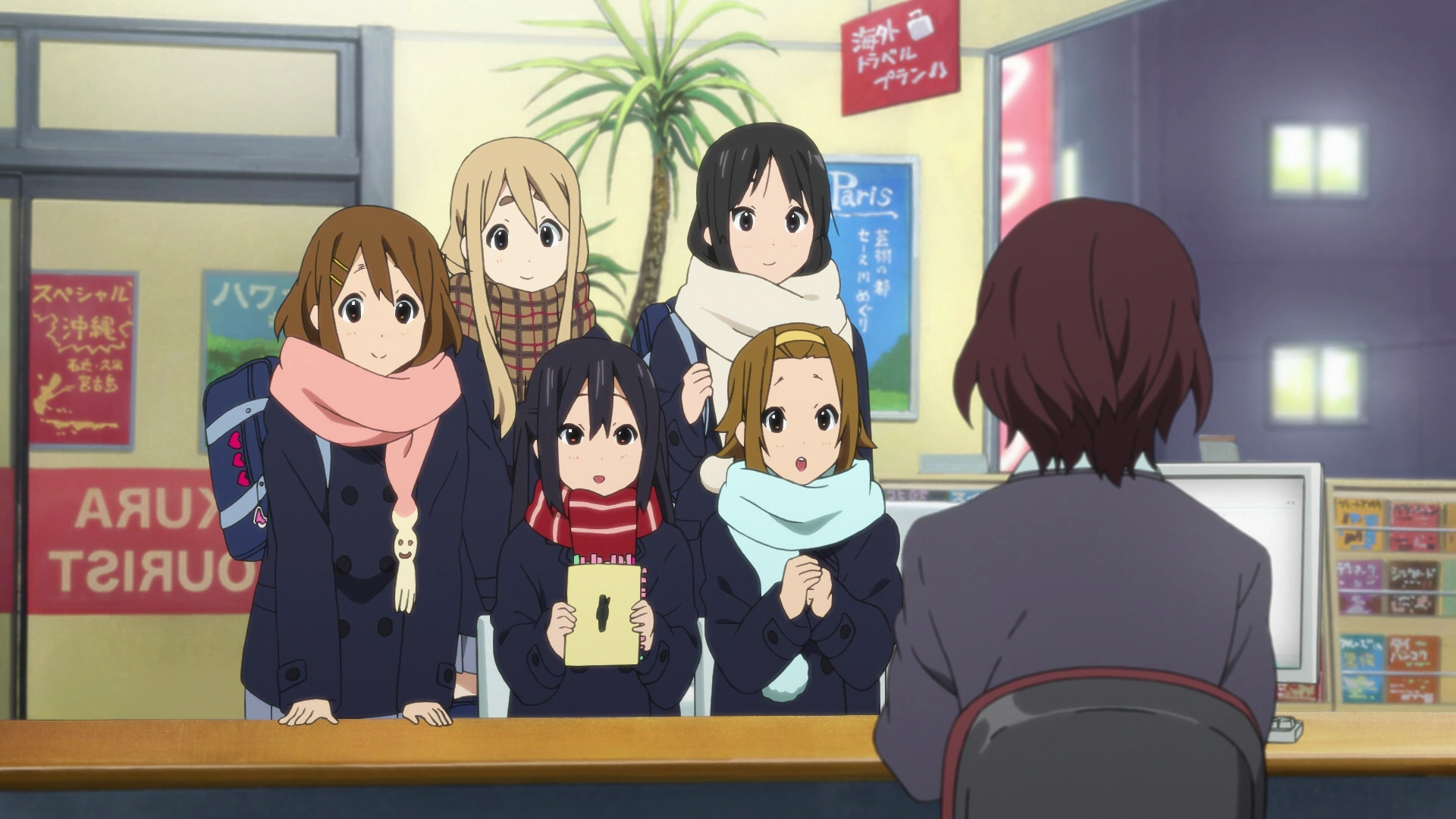 The following day, Azusa and Ui visit a bookstore. Azusa pulls book after book off of the shelf, all of which are about London. She assumes that it's her responsibility to read up as much information as possible since she doesn't think her seniors will. Azusa confides in Ui her lingering impression Yui is hiding something from her. Ui brushes it off, confident that Yui couldn't possibly hide a secret. All five of the girls then visit a travel agent to book the trip. The agent offers a tour for their five days, but since there are so many places they'd like to see, they decide on a personal trip that grants them the freedom to go wherever they'd like.