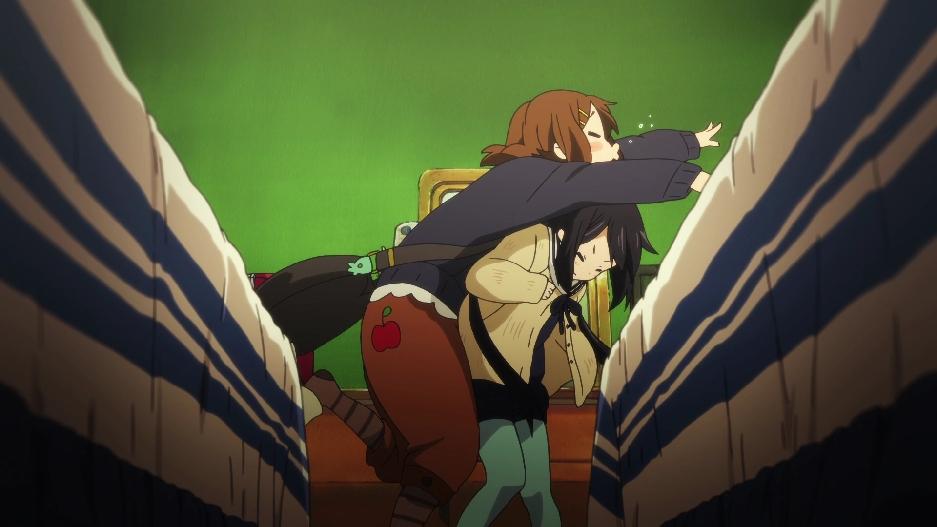 Back at the hotel, Azusa insists to join Tsumugi, Mio, and Ritsu in their room rather than be stuck alone with Yui, but Yui scoots her over into their room anyway. When they're both in the room, Yui charges right at Azusa with open arms, ready to pounce. Azusa taps into her self defense lessons and instinctively coils up to elbow Yui right in the gut, flooring her completely. However, Yui only intended to hug Giita, not Azusa. Realizing her mistake, Azusa swiftly apologizes and hides under her sheets. Assuming that Azusa's going to sleep, Yui cozies up next to her on the bed to sing her a lullaby. Embarrassed and anxious, Azusa curls up under her sheets.
