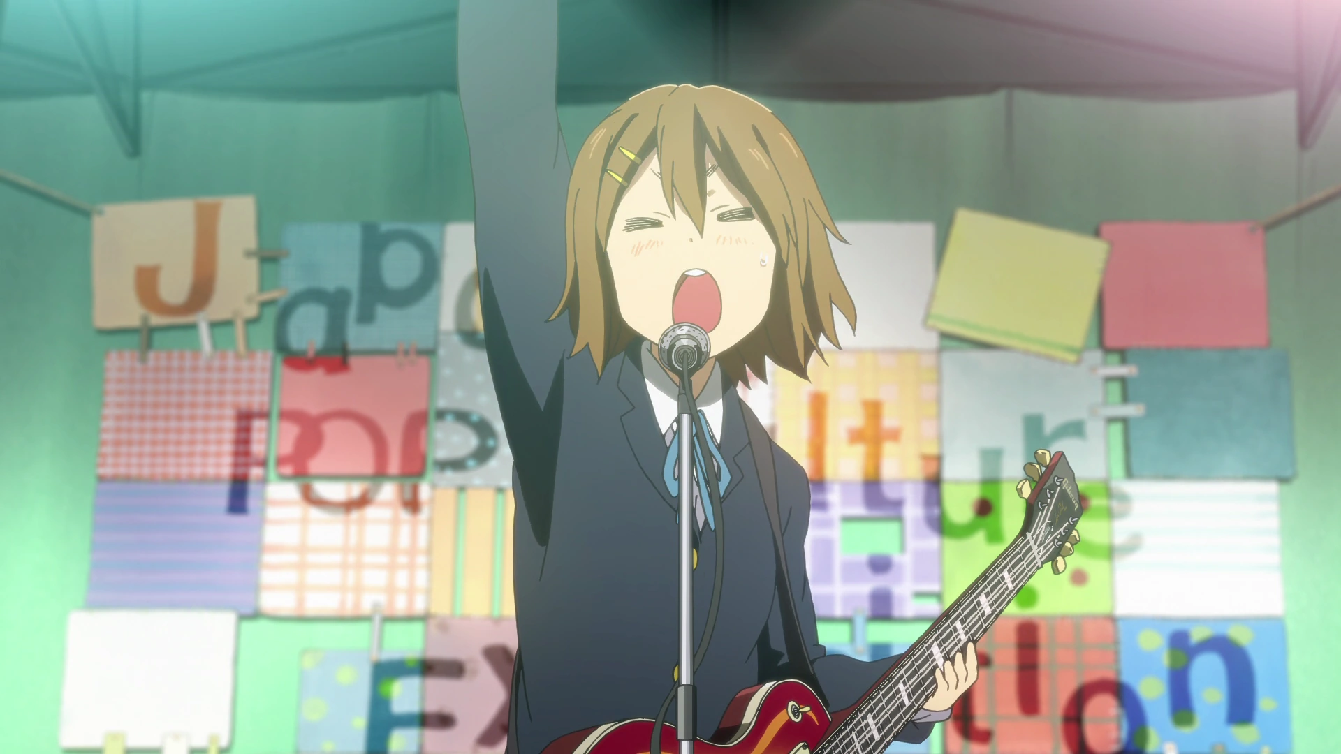 Out of nowhere, Sawako valiantly charges in and plugs in the guitar. Sawako had saved up frequent flyer miles on her credit card that were due to expire soon, so she figured she may as well pop down to London. Turns out she was the mysterious caller from the other night. As expected, Sawako brought along kunoichi costumes for the girls to wear for the show, much to their dismay, but to the crowd's delight. Sawako even had photos on her phone of Nodoka, Ui, and Jun modeling in the outfits. However, Ritsu decides that their uniforms are enough, and they all take their places.