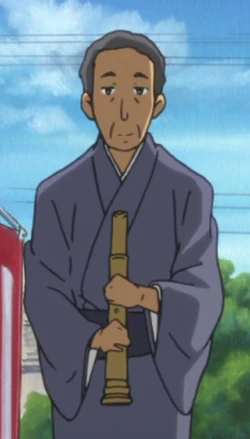 He wears a traditional grey kimono which is secured by a dark-grey obi.