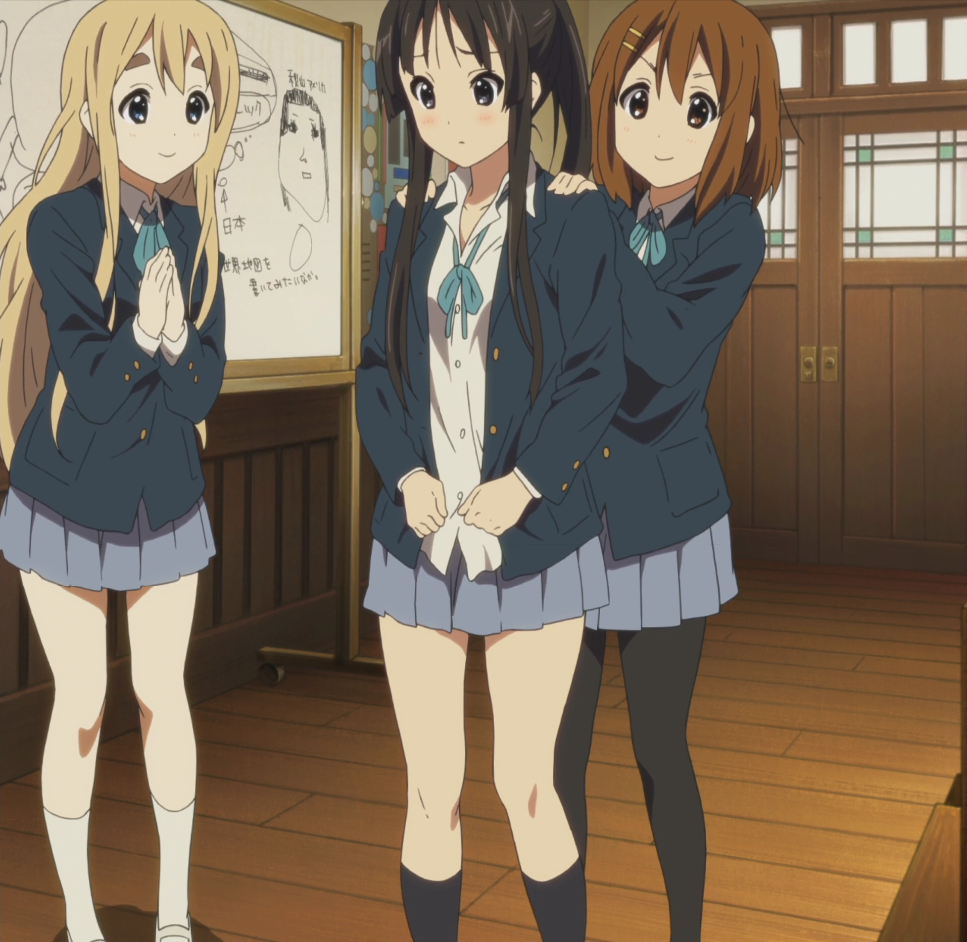 In the clubroom, Mio and Ritsu are still shaken by their new roles, and Azusa can't help but laugh at their predicament. Mio can't seem to calm down, and gets even more anxious when Azusa tries to cheer her up by saying that she's looking forward to it. Mio desperately attempts to deny ever having the role, wanting to change schools, and then 'realizing' she was dreaming all along and that she doesn't have the role. Meanwhile, Yui's been getting into her role, practicing by standing perfectly still as any good tree would.