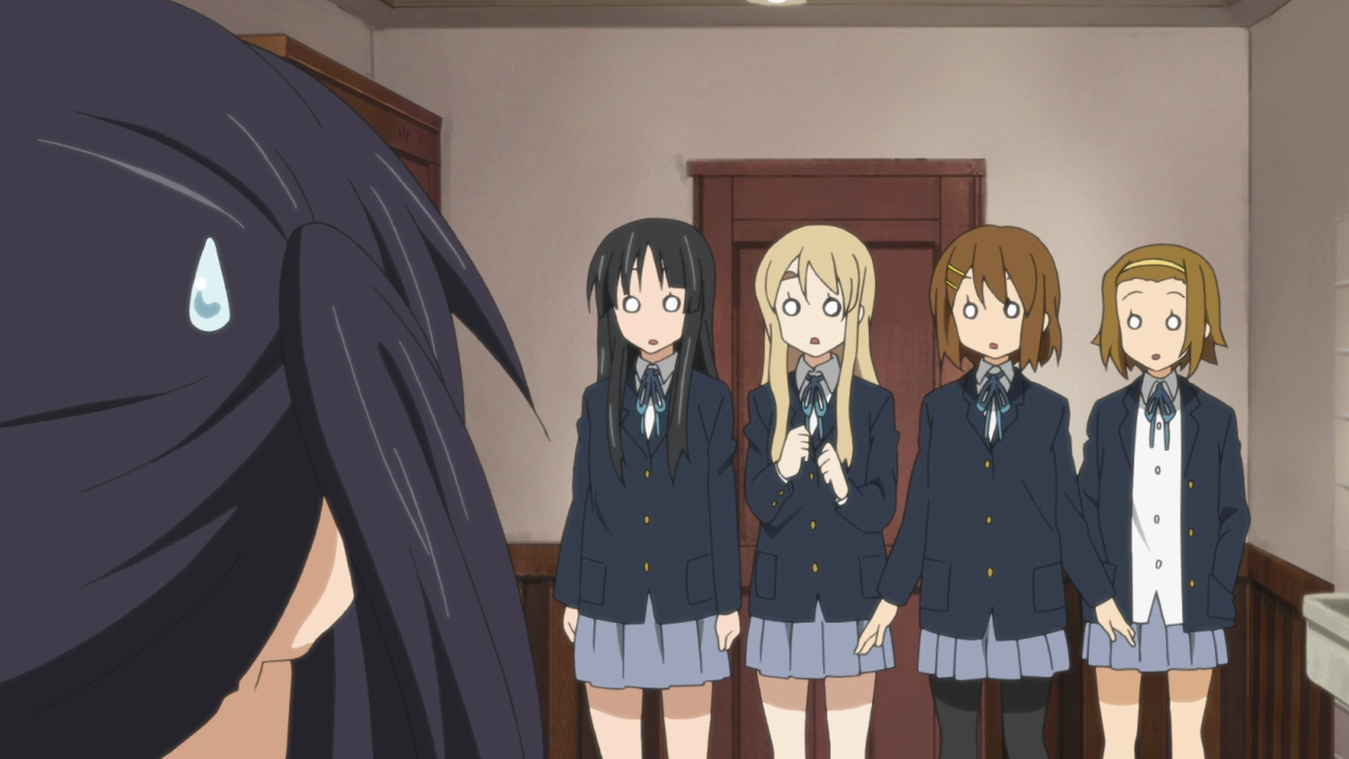 - In the manga, when coming back to the club room and being shown the cat ears, Azusa and the rest of the club were wearing their school sweaters. In this episode, they were only wearing their regular school uniforms.