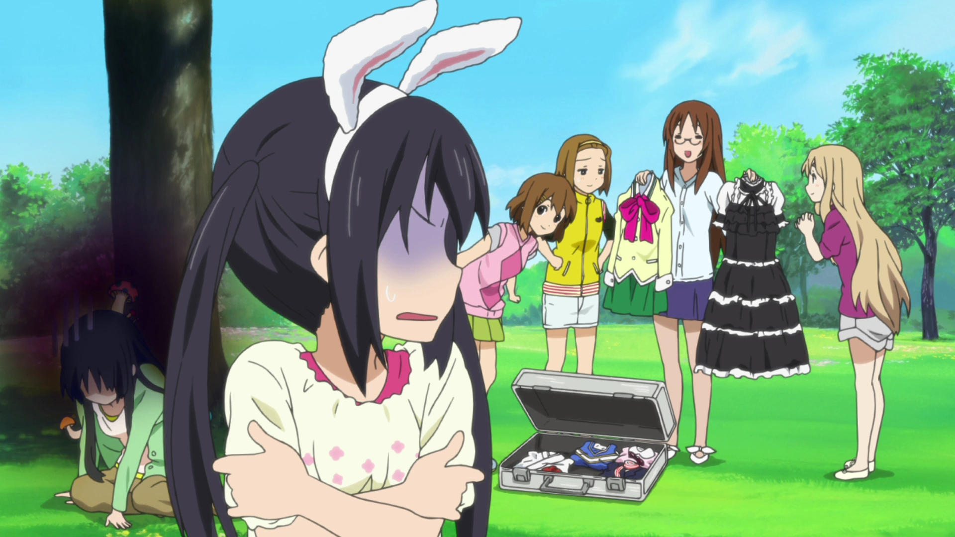 After Azusa reveals a bit more about herself, Sawako gives her cat ears as a present. At first, she struggles to avoid wearing them, but the club finally convinces her. With the exception of Mio, the other members think the ears suit Azusa fantastically and Yui gives Azusa her new nickname, "Azu-nyan".