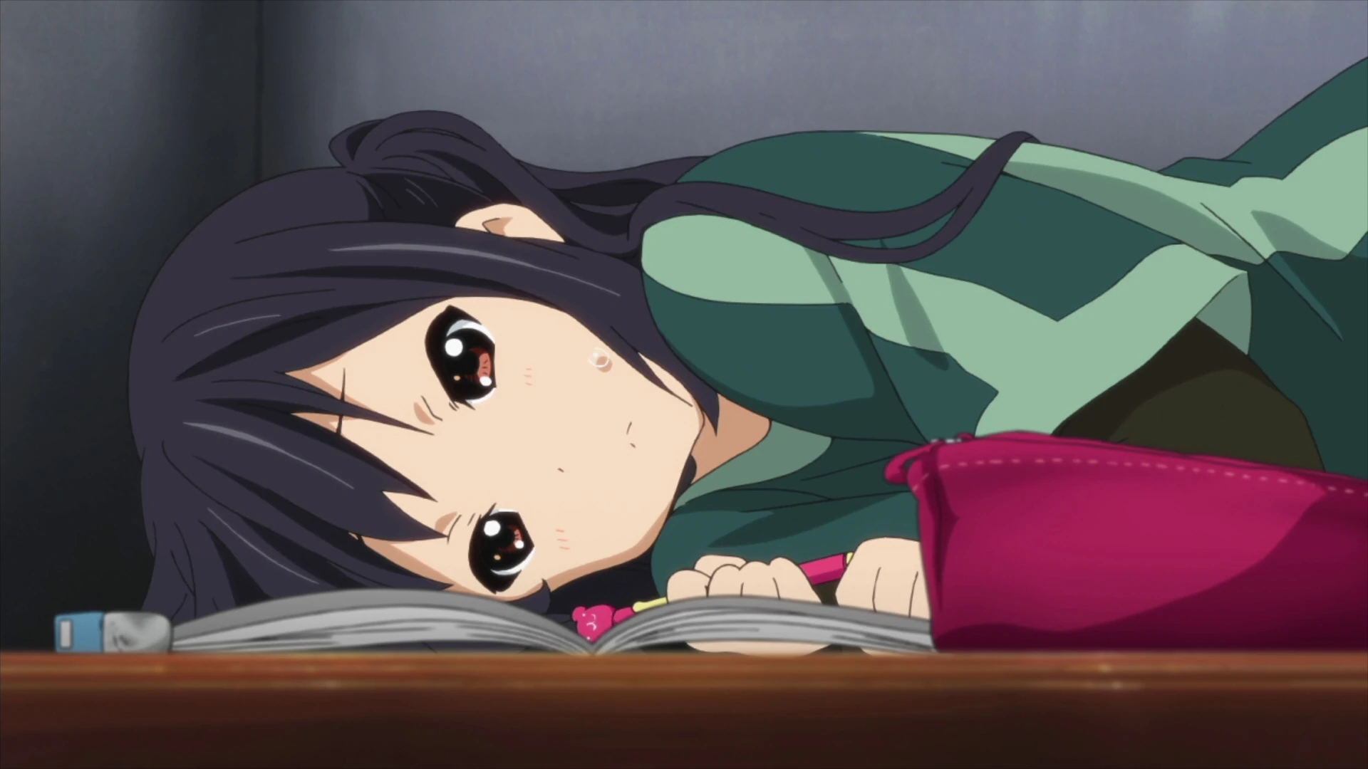 Round four. By now, they're spent and struggling to come up with ideas, though it turns out that their looks of deep thought were actually about what cake they wanted with their tea. After finishing their tea, Tsumugi thinks up of a fresh idea - a two hour long mystery film. At least Ritsu sees how something of that scale may just be a bit out of their immediate reach. Mugi comes up with more intricate, twisting plotlines, but Azusa shoots it down yet again. Seeing as she's turned down the most ideas today, it's Azusa's turn to make a suggestion. She mulls it over, and decides she'll come up with an actual plot.