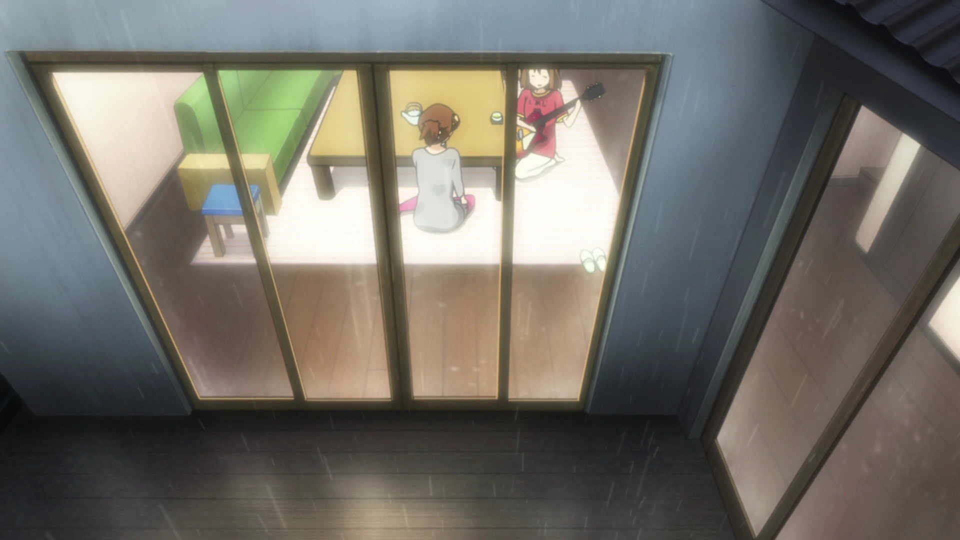 Back home, Ui spots molded lunch from two day ago and is shocked to see what appears to be mold around Yui's mouth as well, but it turns out to be nothing more than mere seaweed. While drinking tea, Ui wishes for the rain to stop once and for all. Yui, however, says that she likes rainy days now since they are relaxing and you can spend time inside with your friends. She then talks with Ui about Gīta and that she hopes to be able to spend much more time playing it. Having said that, she starts playing the old children's song Amefuri and sings it with Ui.