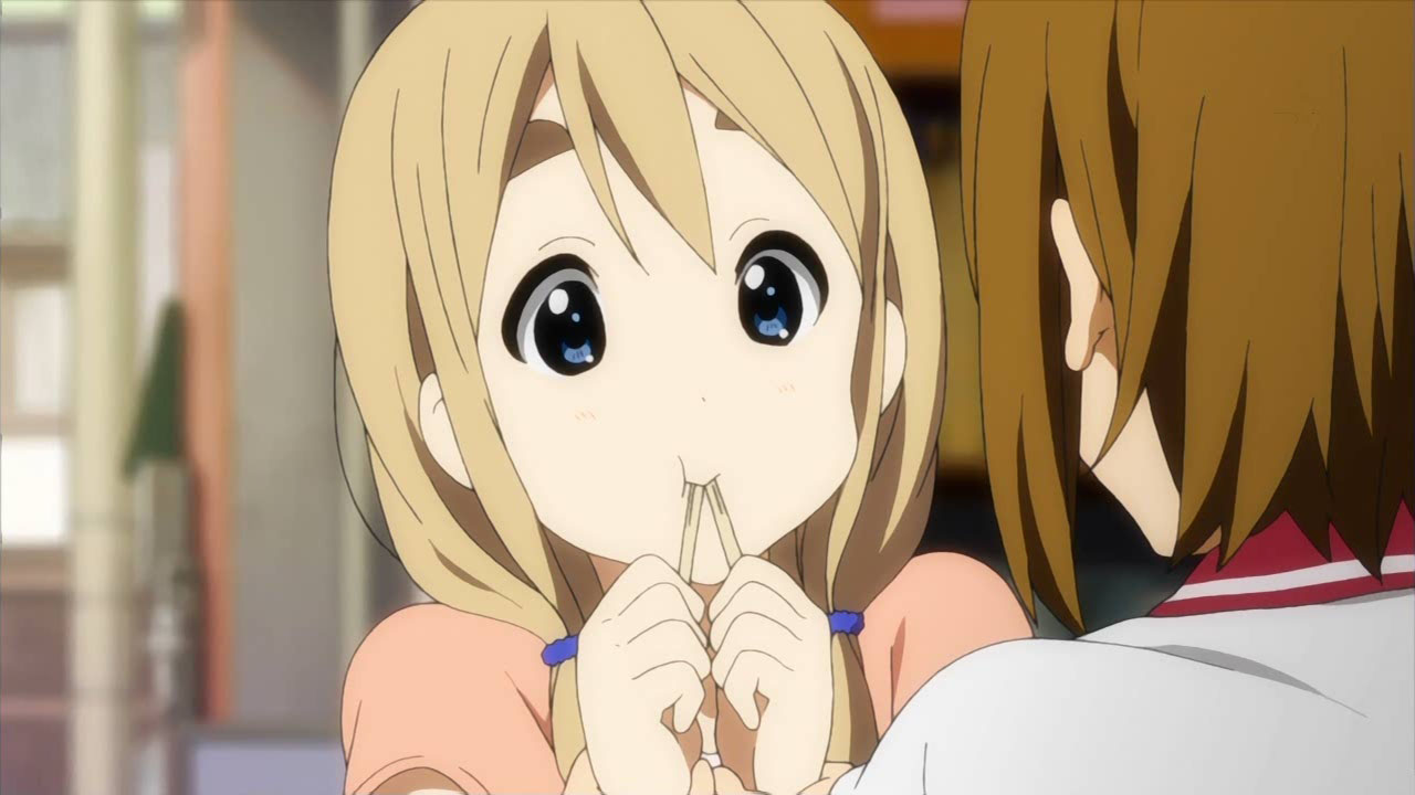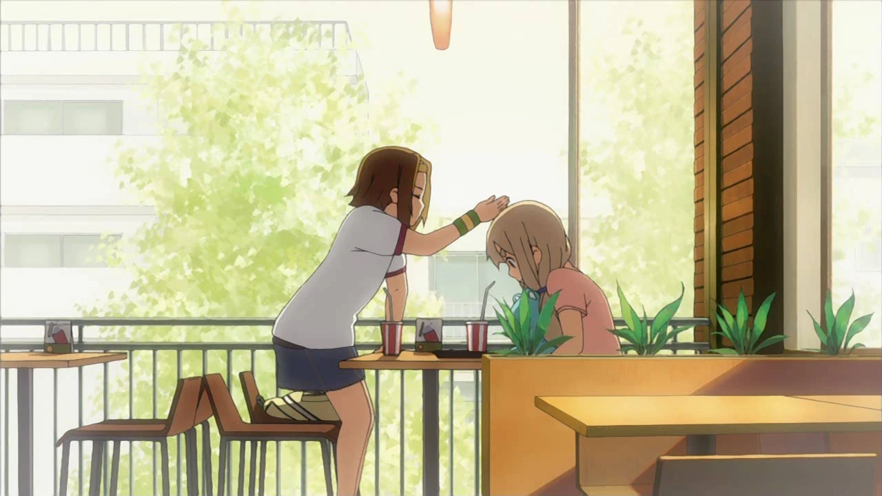 Over lunch at a fast food restaurant, Tsumugi praises Ritsu for having gotten so much out of the day on so little money. Ritsu knows that by normal standards they spent quite a bit, but she lets the comment go. The thought causes her to recall the time Mio hit her for trying to mooch too much money off of her at the music store. This anecdote causes Tsumugi to become unusually sullen and she informs Ritsu that there's been something she's been wanting to ask for a long time. Feeling like she's missing out on physical intimacy that the rest of the club experiences like Mio hitting Ritsu or Yui doting on Azusa, Tsumugi makes a sincere request of Ritsu to hit her. Though she agrees with some hesitation, Ritsu can't bring herself to go through with it — not unless she has a specific reason to do so, like if Tsumugi does something incredibly stupid.