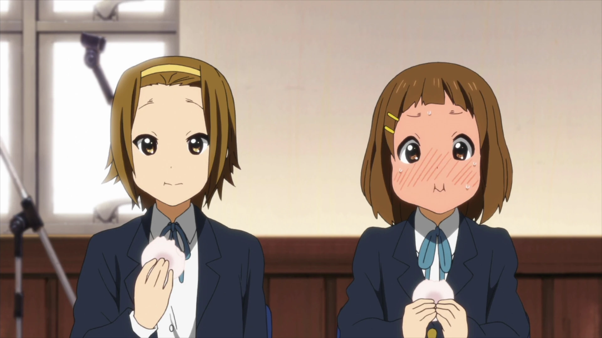 Back to the present, the episode is set shortly after their entrance exams, so the seniors are technically not supposed to be at school. Yet today, they visit the school since Nodoka is receiving the first mockup of the yearbook is coming in and is going to show it to the girls. As Yui, Mio, and Ritsu flip through it, they're instantly embarrassed by their photos. Mio and Ritsu think they both look weird, and Yui's still reeling from her haircut incident. Yui pleads with Nodoka to retake the photo, but she has neither the time nor resources to handle all of the other requests that would flood in if she complied with Yui's.