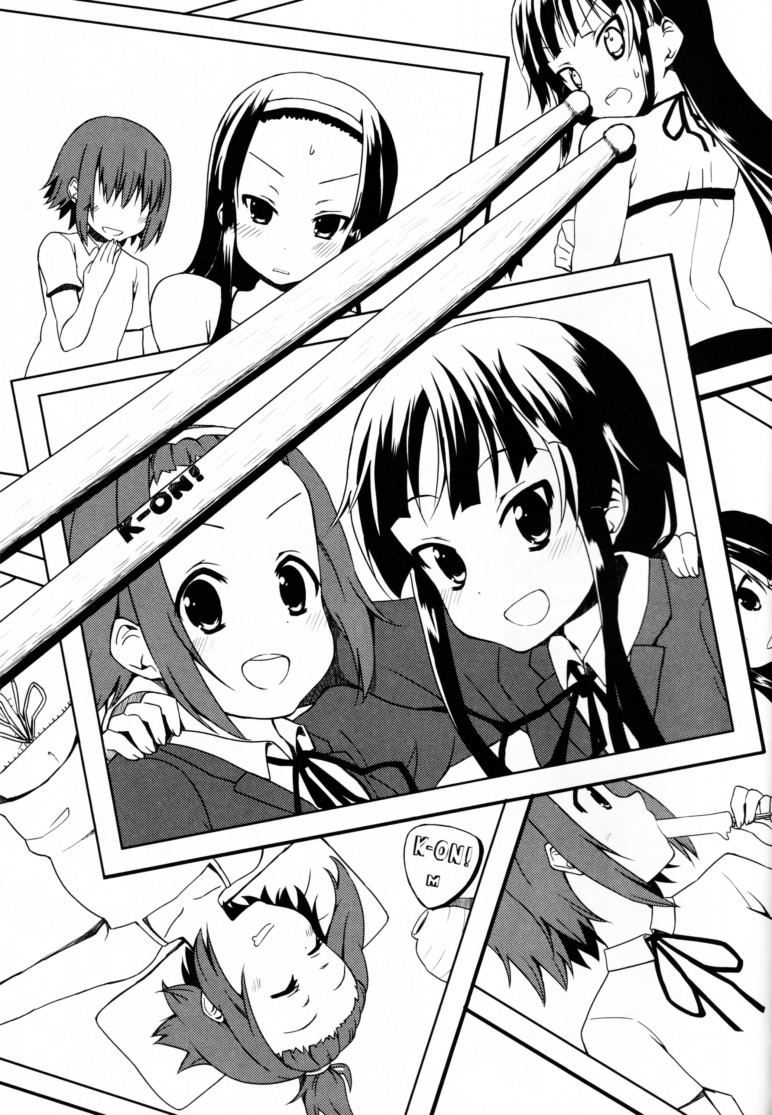 Interested, Mugi asks Mio how it actually happened and Yui quickly joins her. Mio struggles with telling them and attempts to start practice again, but even Azusa seems to be completely interested, so Mio has no other choice. Ritsu starts explaining that back in elementary school, Mio was a very shy and meek girl who never talked a lot. One day, Ritsu became interested in her and started picking on her on a daily basis, something Yui shows envy for in the present. Being reminded at her past, Mio starts getting irritated and draws the kanji for "eye" (目) on Ritsu's forehead as punishment. Mugi still insists to hear about the start of their friendship, so Mio continues with the story.